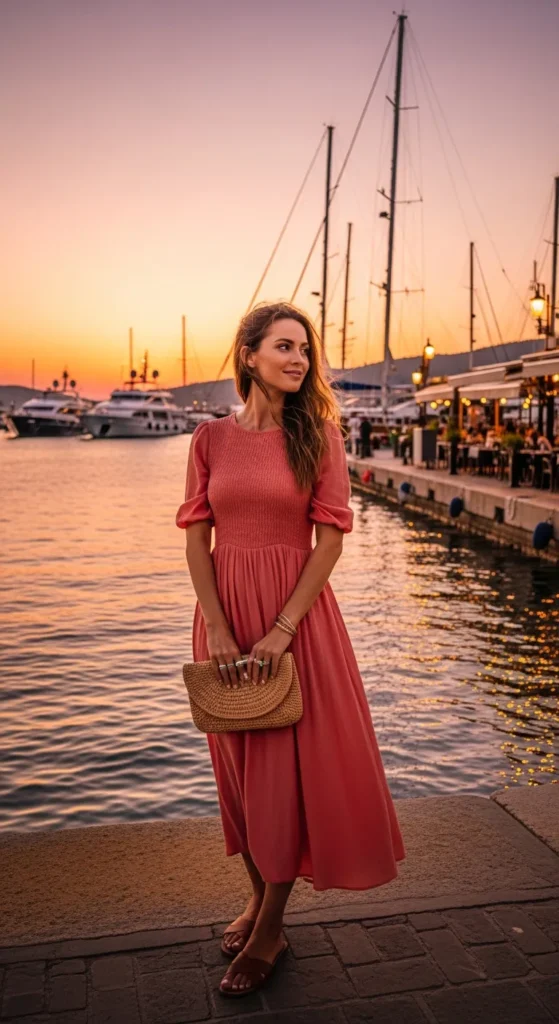 A smock bodice midi dress hugs gently while remaining breathable. It’s perfect for seaside towns and open-air dinners.