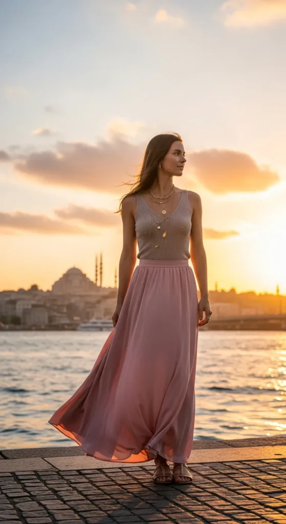 A fitted ribbed tank and airy maxi skirt create a feminine silhouette that feels perfect for sunset walks by the Bosphorus. The contrast of fitted and flowy gives dimension without overcomplicating.