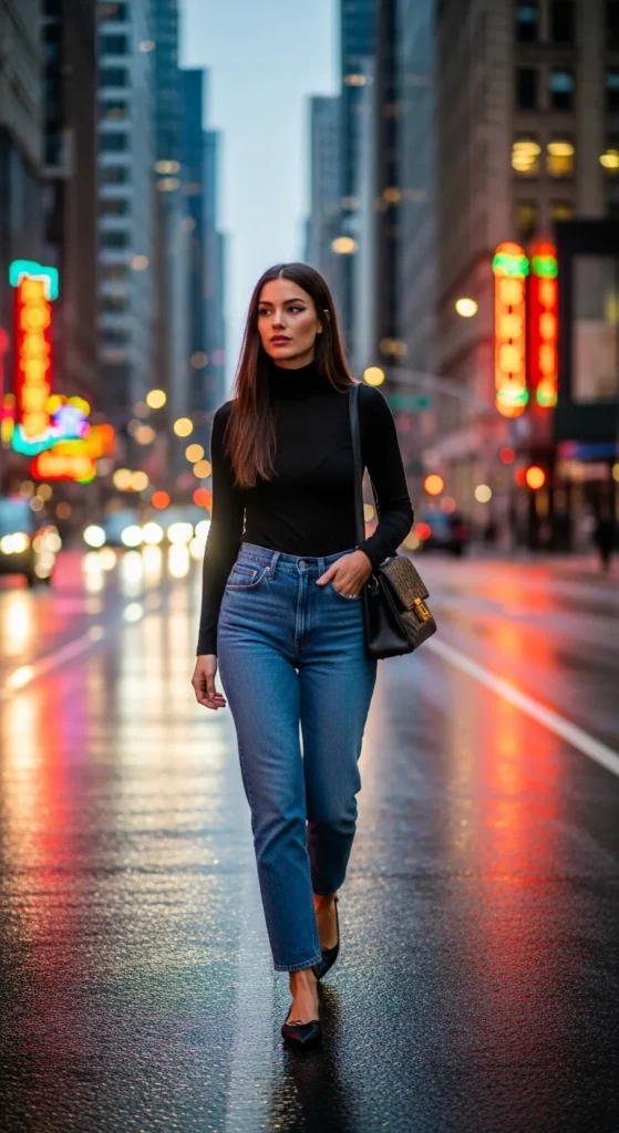 A thin black turtleneck tucked into relaxed straight-leg jeans creates an effortless city look. It feels understated yet sharp, perfect for evening coffee dates or spontaneous summer plans downtown.