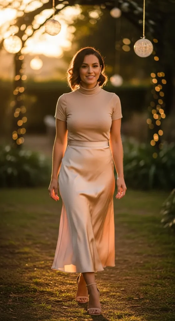 A smooth fitted turtleneck paired with a satin slip skirt creates an elegant evening silhouette. The mix of matte and sheen feels subtle but elevated, perfect for date nights.