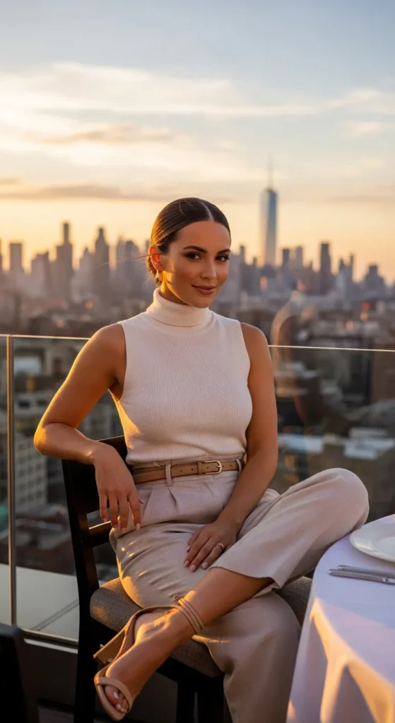 An ivory sleeveless turtleneck tucked into tailored linen trousers creates a clean, elongated silhouette. The soft structure feels polished yet breathable, perfect for sunset dinners or casual evening meetings when you want to look quietly confident.