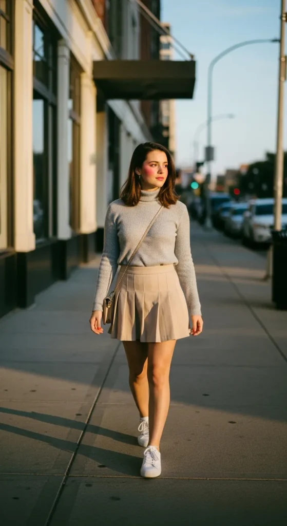 A breathable knit turtleneck paired with a pleated mini skirt feels youthful but polished. It’s perfect for casual evening strolls or relaxed summer events.