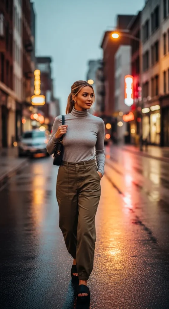 A thin turtleneck paired with relaxed cargo pants feels modern and slightly edgy. It’s comfortable for laid-back summer evenings without losing structure.