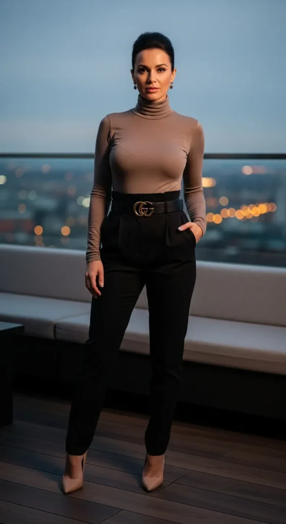 A fitted neutral turtleneck tucked into tailored trousers with a bold belt buckle adds subtle drama. It’s sleek and sophisticated without trying too hard.