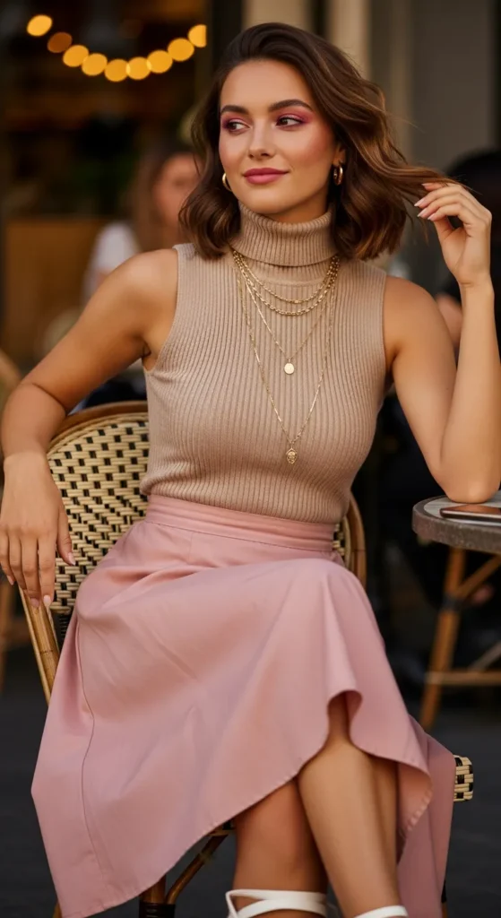 A fitted ribbed turtleneck tank paired with a flowy A-line midi skirt balances structure and softness. It feels romantic yet modern, ideal for a summer evening walk or a casual outdoor dinner with friends.