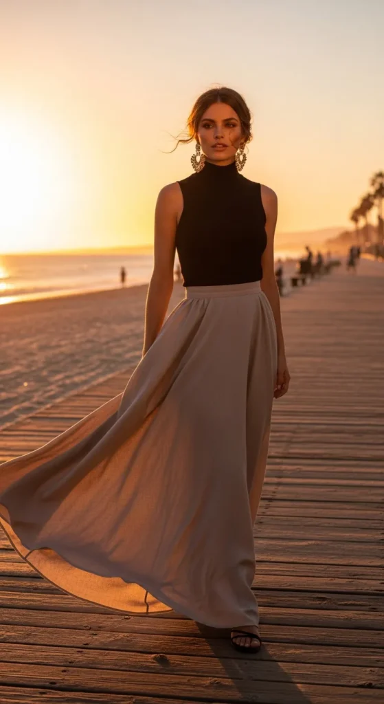 A sleeveless black turtleneck styled with a breezy linen maxi skirt feels elegant and grounded. It moves beautifully with the wind during evening walks.