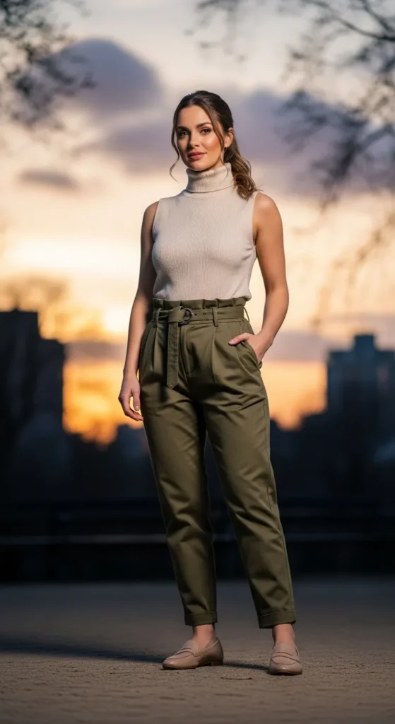A sleeveless turtleneck tucked into paperbag waist trousers defines the waist beautifully while staying comfortable. It feels chic yet wearable for casual evening gatherings.