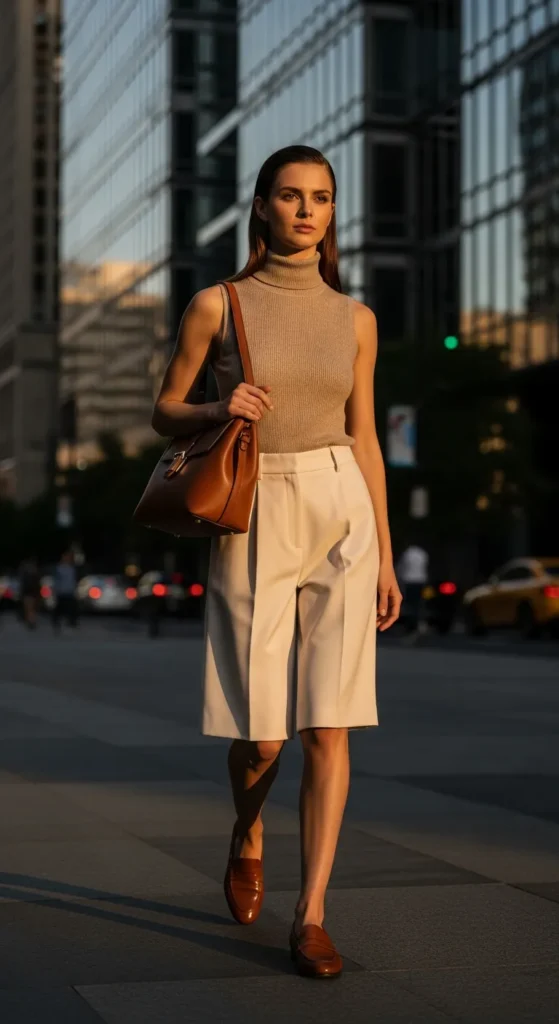 A soft beige turtleneck with tailored Bermuda shorts feels polished yet relaxed. It’s ideal for creative events or relaxed work dinners.