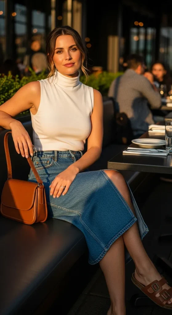 A crisp white turtleneck tucked into a classic denim midi skirt feels timeless and fresh. It’s simple but refined, ideal for summer evening dinners.