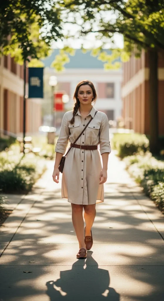 An oversized shirt dress cinched at the waist with a slim belt offers effortless comfort and style. Lightweight fabrics make it perfect for warm campus days while maintaining a chic silhouette.