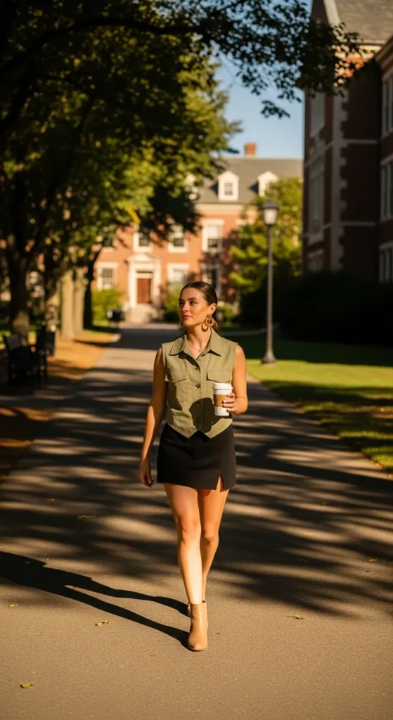 A lightweight button-up vest over a fitted mini skirt offers an edgy summer campus aesthetic. Layering adds dimension while keeping the outfit breathable and stylish.