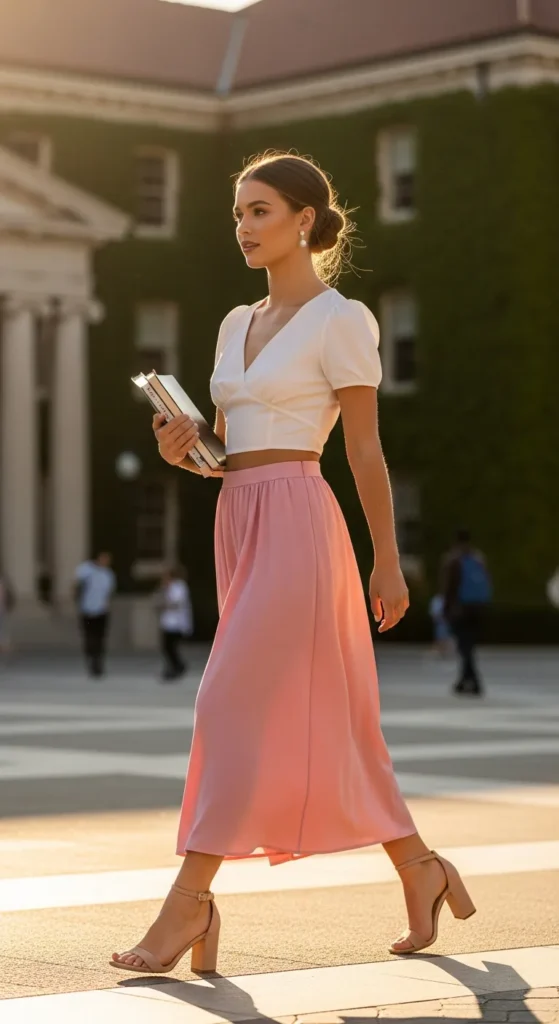 A cropped blouse paired with a high-waist skirt creates a structured yet playful summer campus outfit. Light fabrics keep it airy while the high waist emphasizes flattering proportions.