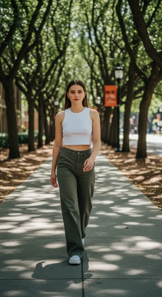 Cropped tank tops paired with high-waist wide-leg pants create a sleek, modern summer silhouette. Light, breathable fabrics make this combination ideal for warmer days on campus while staying stylish and comfortable.