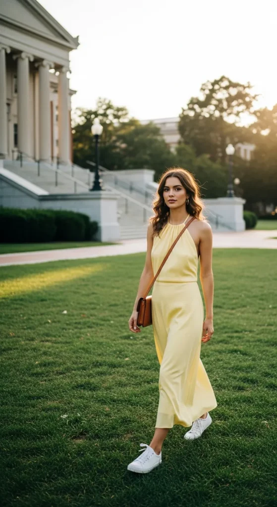 A fitted halter midi dress with casual sneakers mixes elegance with relaxed summer vibes. Its breathable fabric ensures comfort while the sneakers keep the outfit practical for campus walking.