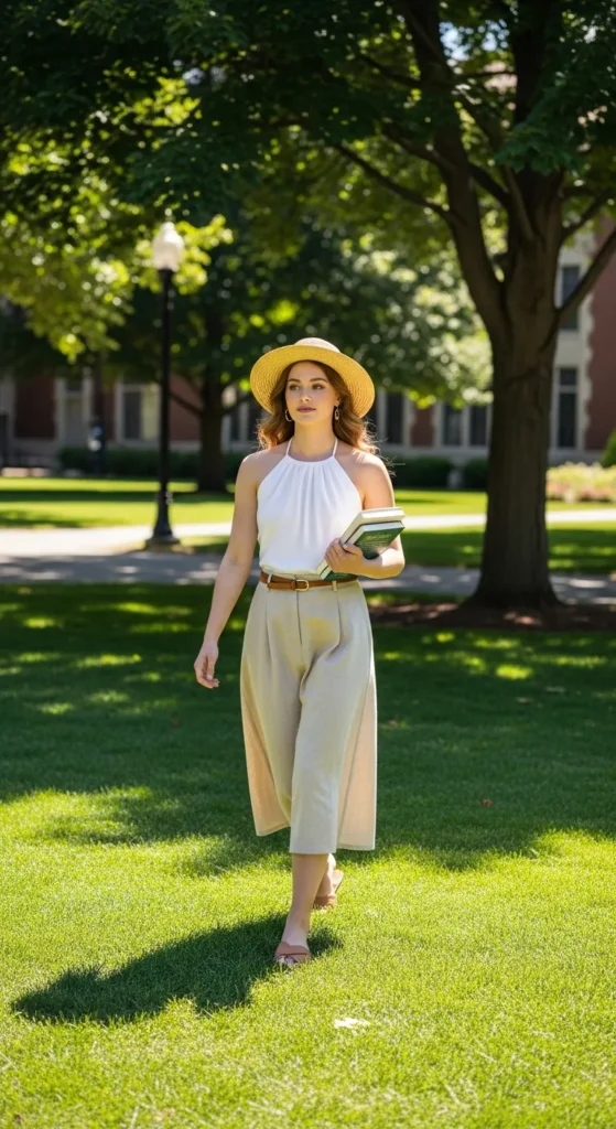 A halter top combined with a lightweight linen skirt keeps you cool and stylish. Its breezy, summer-ready feel makes it perfect for walking across campus or hanging out with friends.