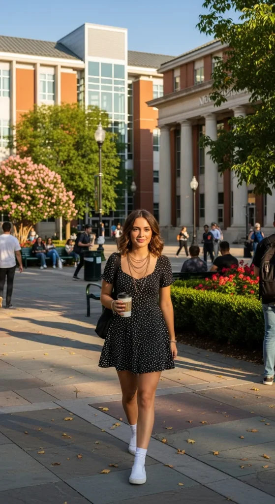 A playful polka dot mini dress paired with clean sneakers creates a fun, approachable summer campus look. Lightweight fabric ensures all-day comfort while keeping the outfit visually dynamic.