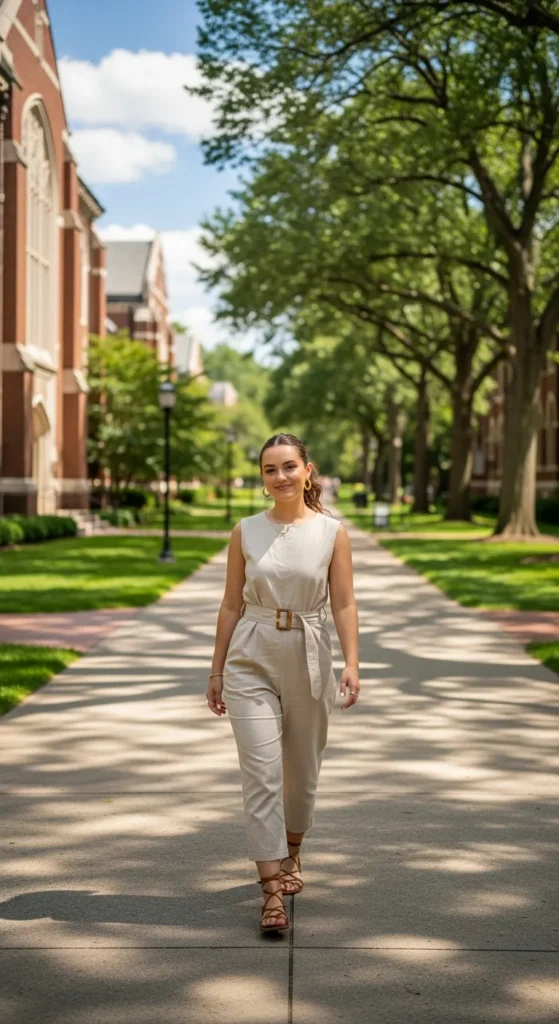 A sleeveless, belted jumpsuit in a neutral tone is practical yet fashion-forward for campus days. Its one-piece design keeps styling simple while the belt accentuates your figure effortlessly.