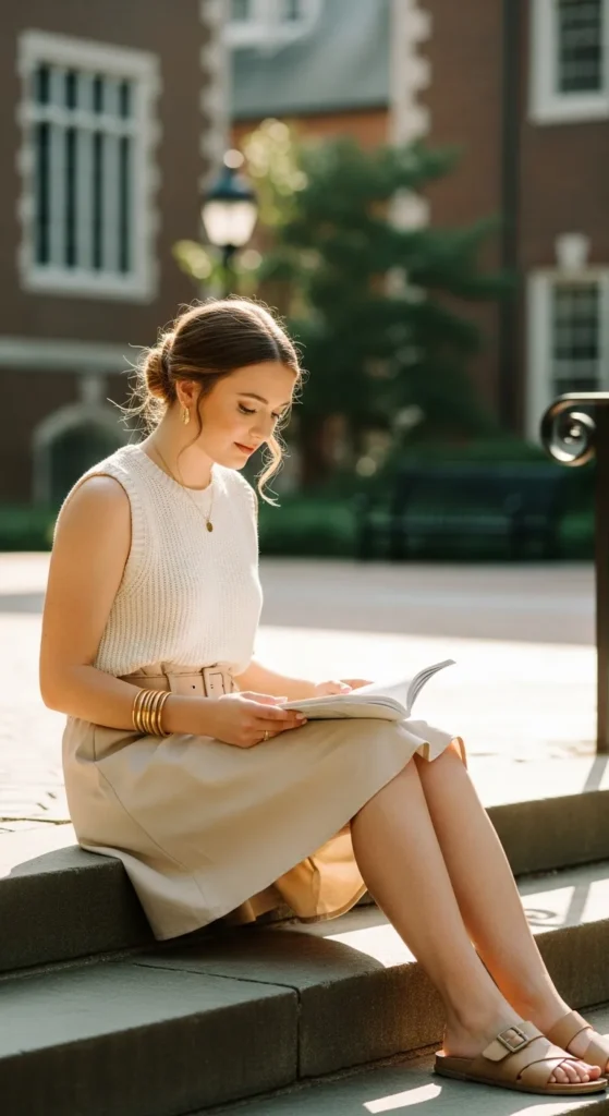 A sleeveless knit top tucked into a paperbag skirt offers relaxed elegance. Soft knit textures paired with light cotton skirts create a comfortable yet stylish summer campus look.