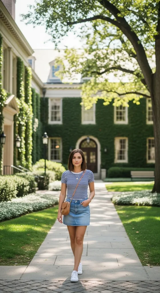 A classic striped tee with a denim mini skirt gives a casual yet put-together appearance. This combination is perfect for laid-back summer classes, adding a timeless charm with playful summer energy.