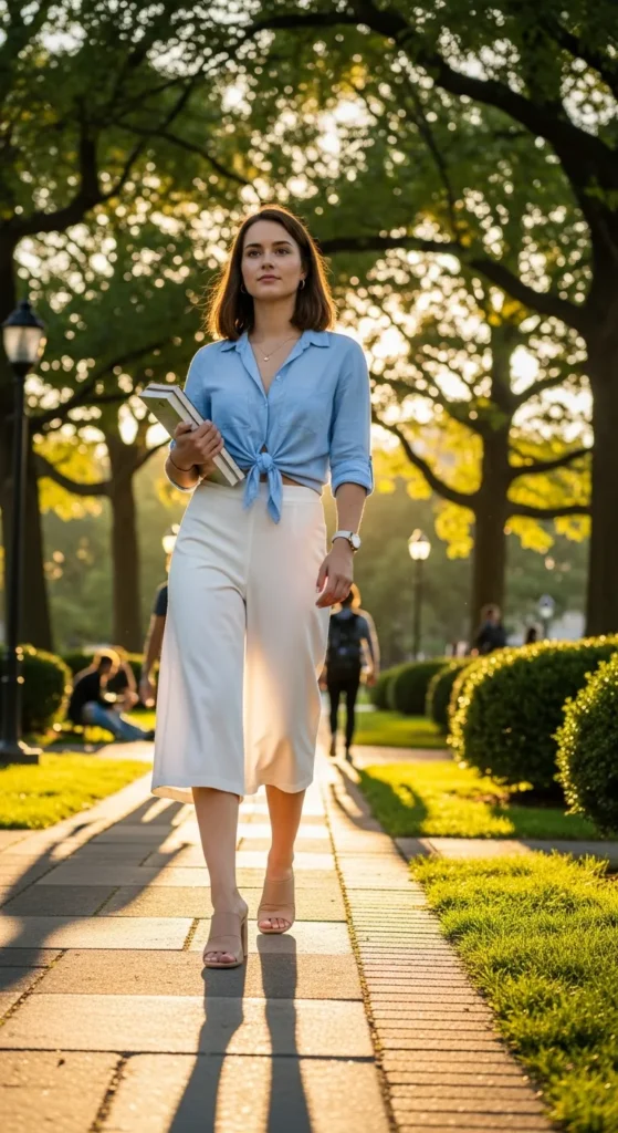 A tie-front shirt matched with flowy culottes offers a relaxed yet refined summer look. Soft cotton fabrics keep it breathable, while the tie detail adds a youthful, energetic touch for campus life.