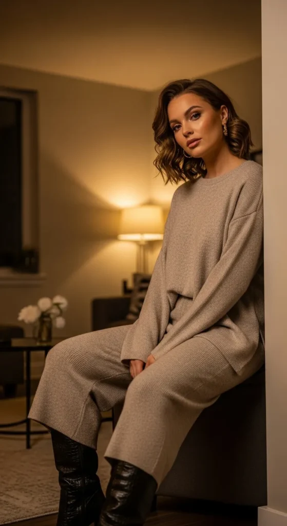 A fitted knit co-ord set feels cozy yet powerful when styled right. It hugs the body softly while still making a statement, perfect for a confident but relaxed Valentine’s aesthetic.