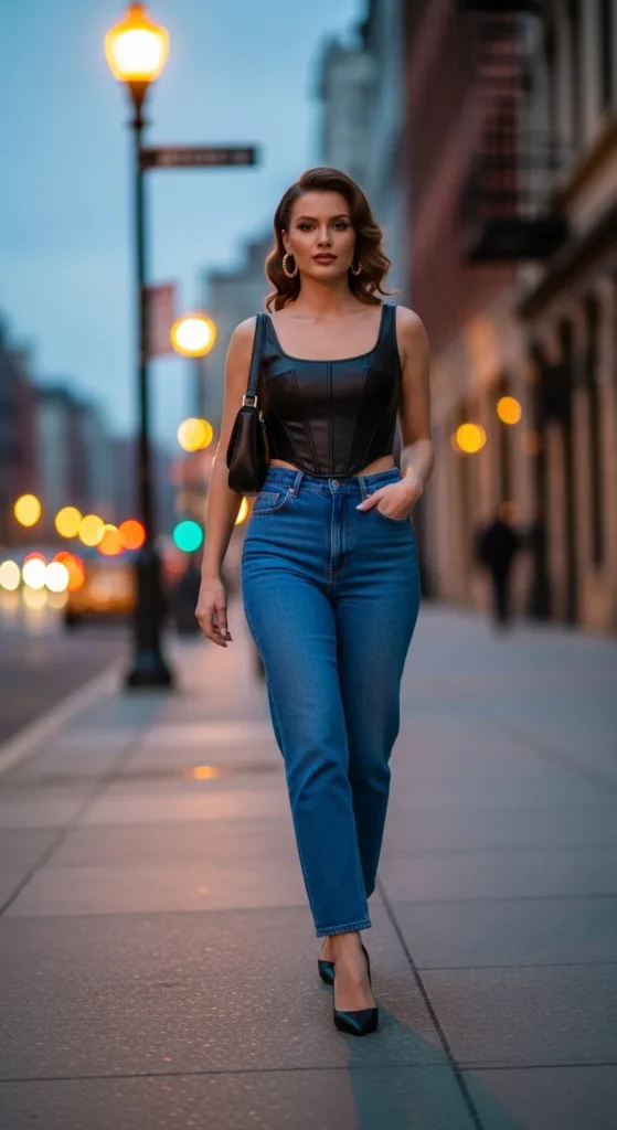Stylist Suggestion: Add pointed-toe heels and a sleek shoulder bag to sharpen the outfit. The clean lines of the corset deserve minimal accessories so the silhouette stays strong and intentional.