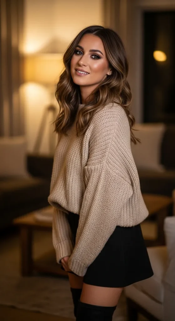 An oversized sweater paired with a mini skirt creates cozy confidence. It feels flirty without trying, perfect for Valentine’s when comfort and style need to coexist.