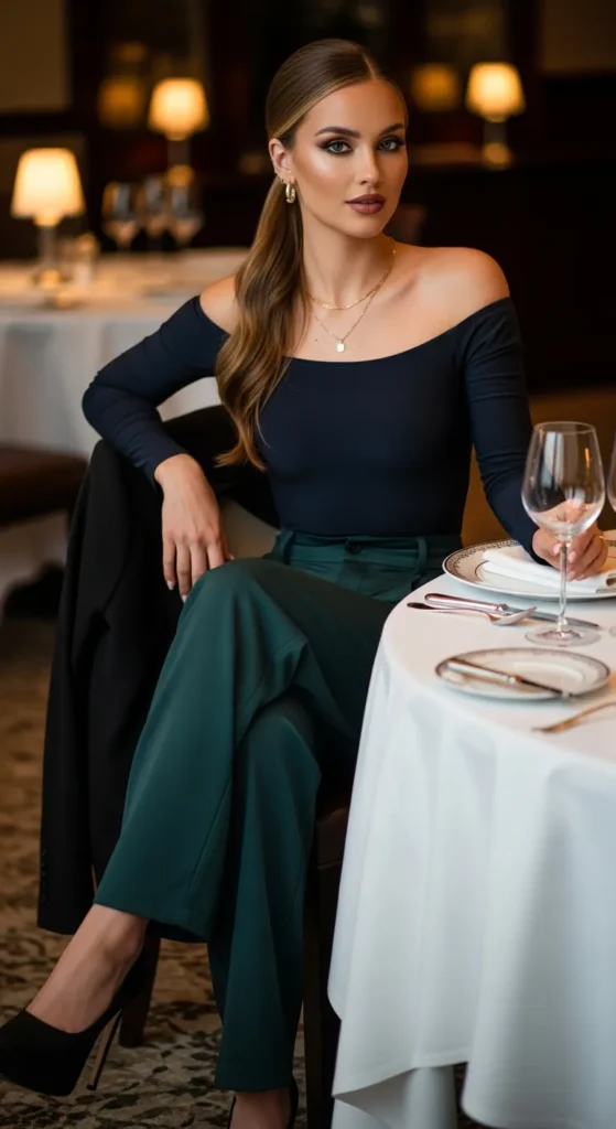 An off-shoulder top brings softness while wide-leg pants add power. This outfit feels confident and romantic at once, ideal for Valentine’s when you want elegance without stiffness.