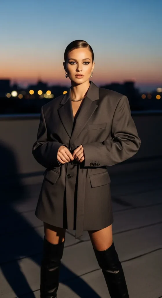 An oversized blazer worn as a dress gives boss energy with a flirty edge. It’s bold, confident, and perfect for Valentine’s when you want to look powerful while still owning your femininity.