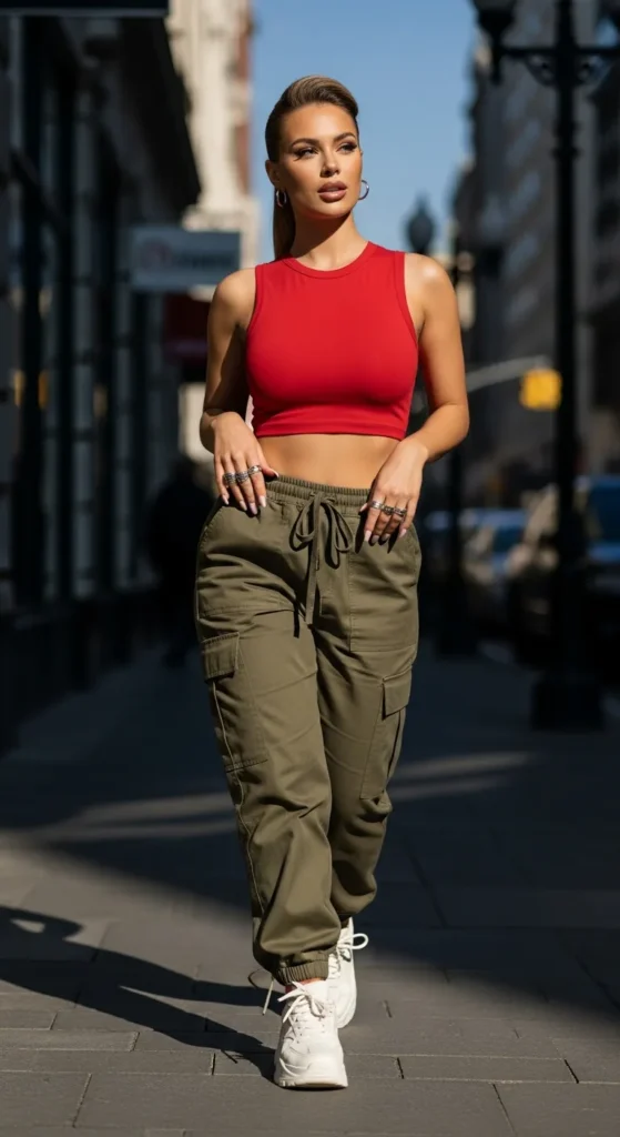 Stylist Suggestion: Layer chunky sneakers or platform boots to match the utility feel of cargos. Keep jewelry simple so the red top remains the emotional focal point.