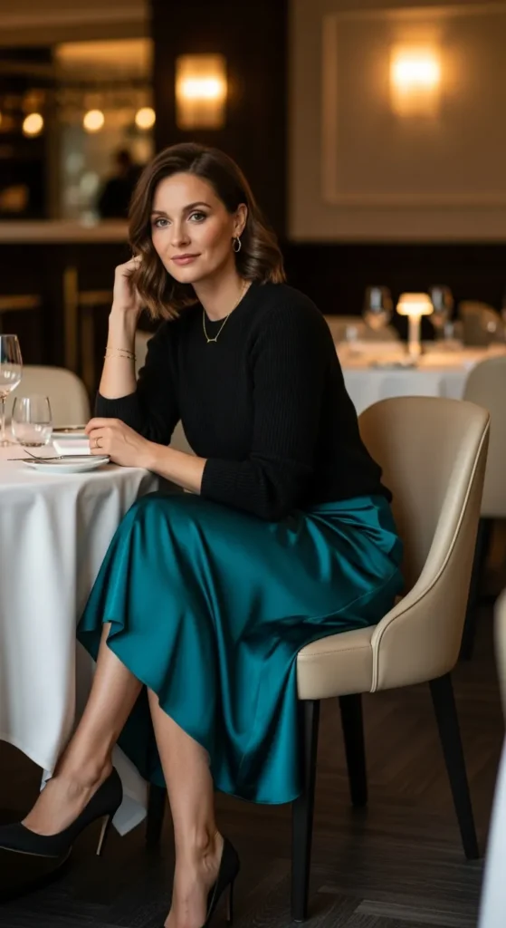 A satin midi skirt paired with a fitted sweater creates soft luxury with confidence. It feels romantic yet grounded, perfect for Valentine’s plans that call for comfort and elegance together.