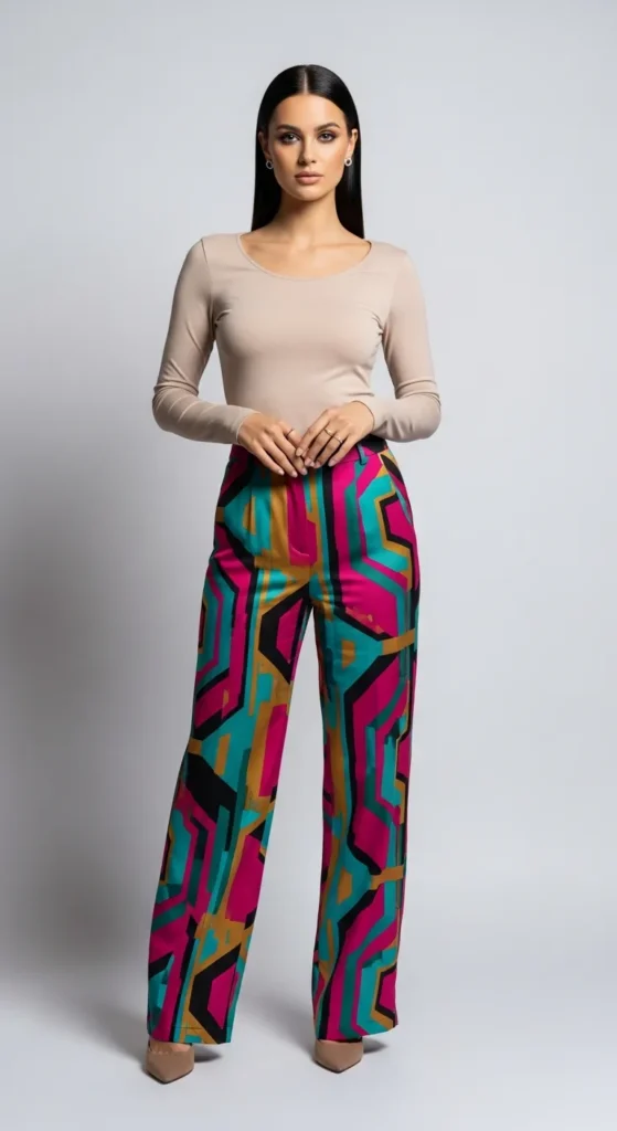 Bold statement pants paired with a clean fitted top let the outfit speak for itself. This look is confident, playful, and ideal for standing out without feeling overstyled.