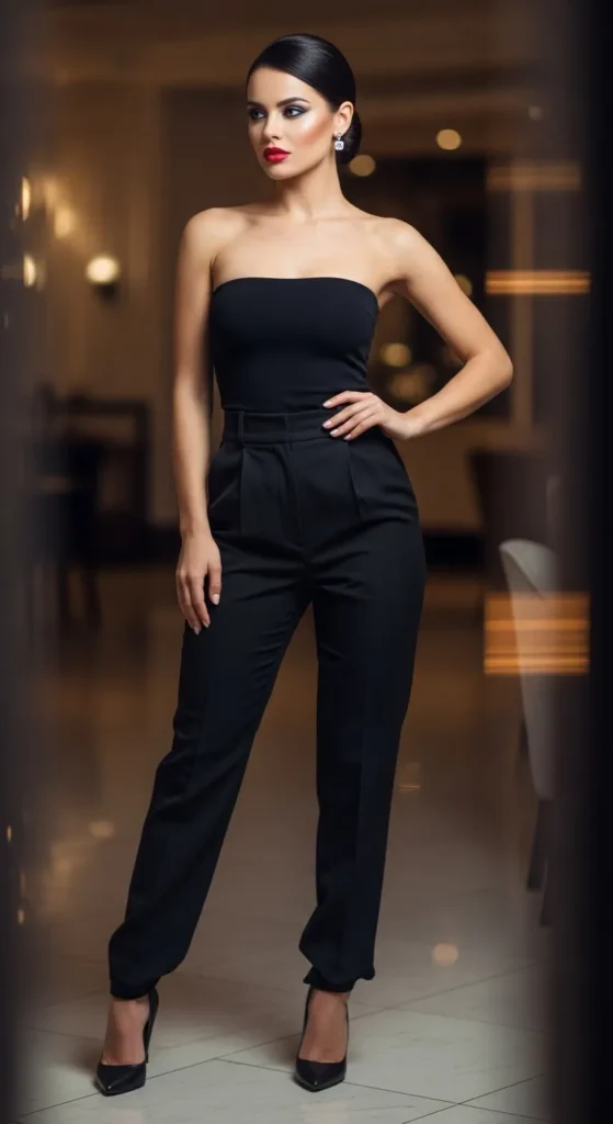 A strapless top paired with tailored pants feels bold and grown. It highlights confidence through clean lines and structure, making it ideal for a stylish Valentine’s evening.