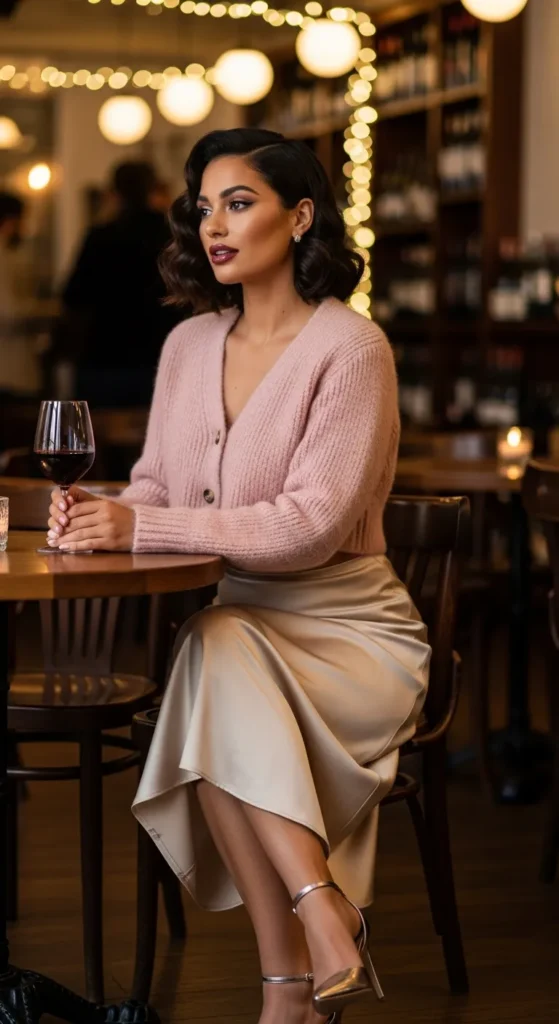 A cropped cardigan feels sweet and approachable, while a satin skirt brings softness and shine. Together, they create a playful contrast that feels flirty, feminine, and easy to wear for casual date nights.