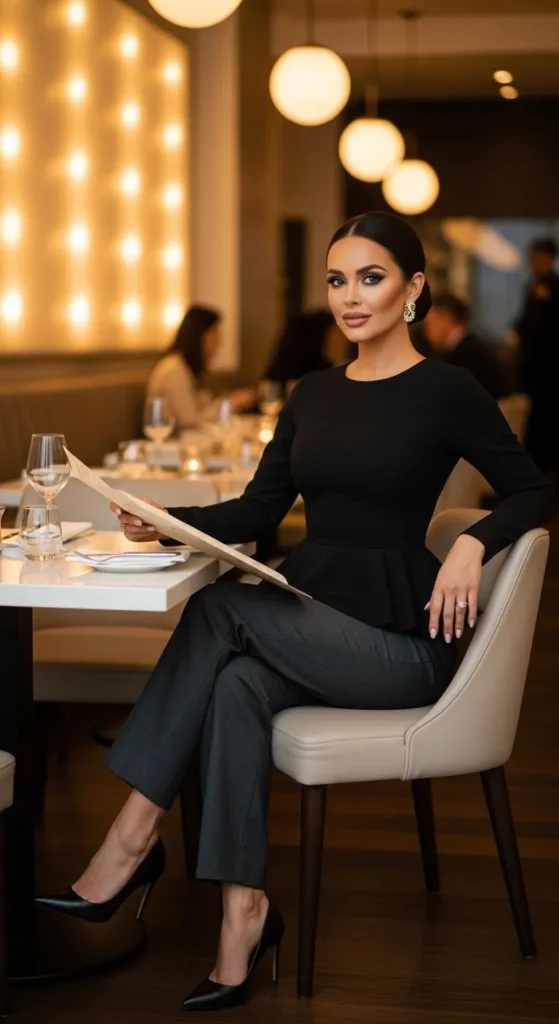 A peplum top adds shape and movement, making the outfit feel playful and flattering. Straight pants keep things balanced and comfortable for longer date nights.