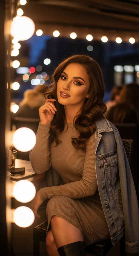 A ribbed bodycon dress feels flirty and comfortable, while a denim jacket tones it down for an effortless vibe. This look works beautifully for casual dinners or spontaneous Valentine’s plans.