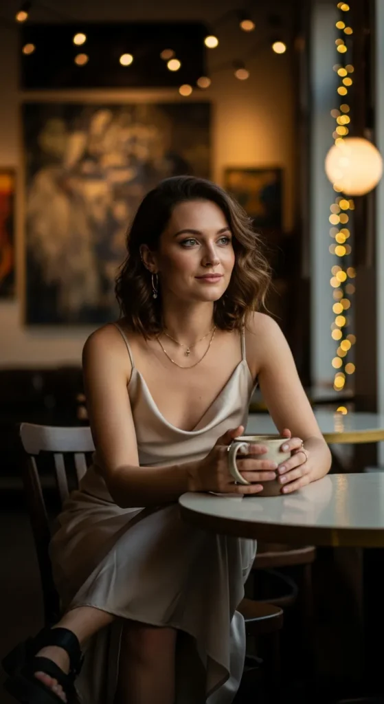 A simple slip dress becomes effortlessly cool when paired with chunky sandals. The contrast feels modern, confident, and perfect for creative date nights or casual Valentine’s plans.