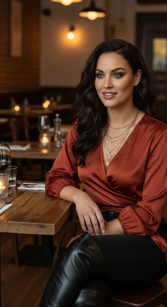 A wrap top naturally flatters the waist and creates a soft neckline. Paired with dark jeans, it feels flirty, confident, and perfect for low-pressure Valentine’s plans.