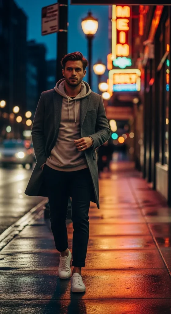 A clean hoodie layered under a structured coat balances comfort and polish. It feels modern, protective, and emotionally reassuring, ideal for Valentine’s walks, coffee dates, or evening city plans.