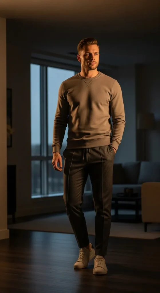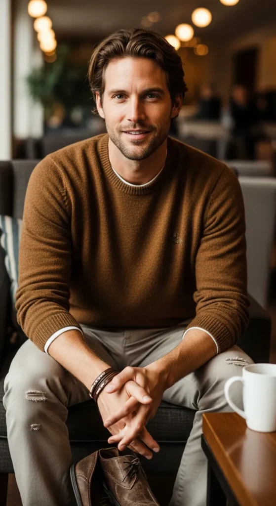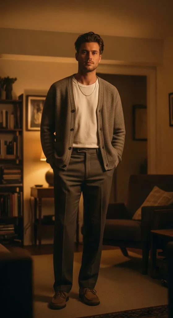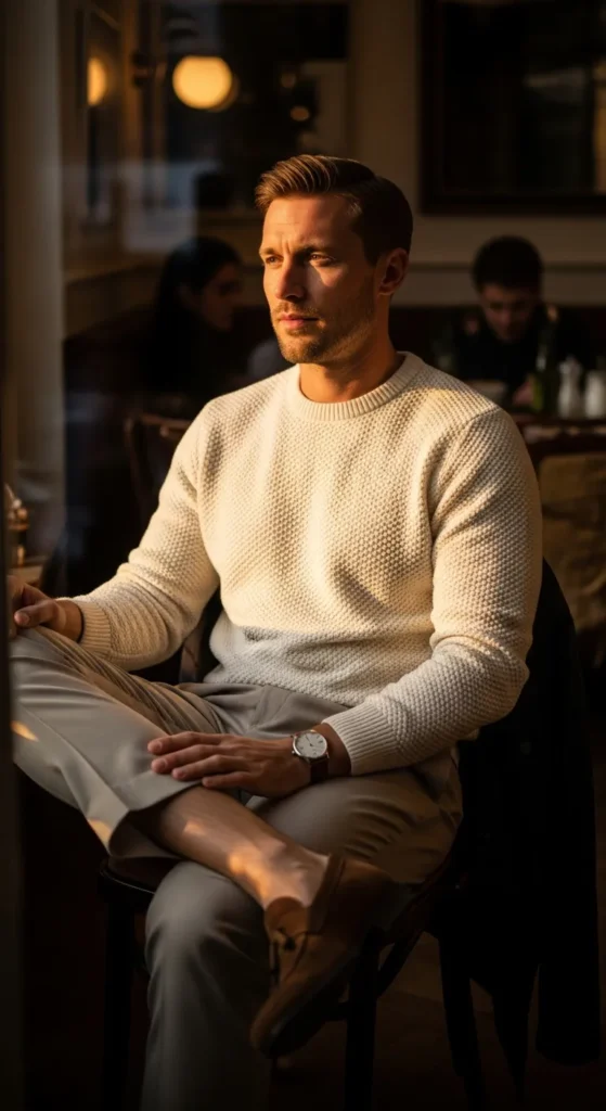 Stylist Suggestion: Pair this with suede loafers and a slim leather watch. The softness of suede balances the knit texture and keeps the outfit feeling cozy instead of formal.