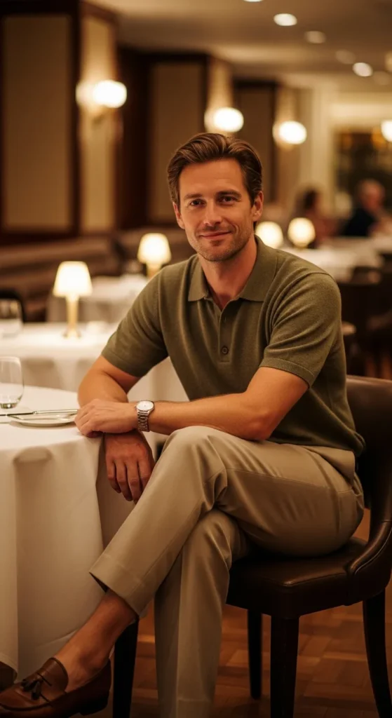 A knit polo feels intimate and nostalgic, blending softness with structure. Paired with straight pants, it creates a romantic, emotionally warm look perfect for relaxed Valentine’s dinners.