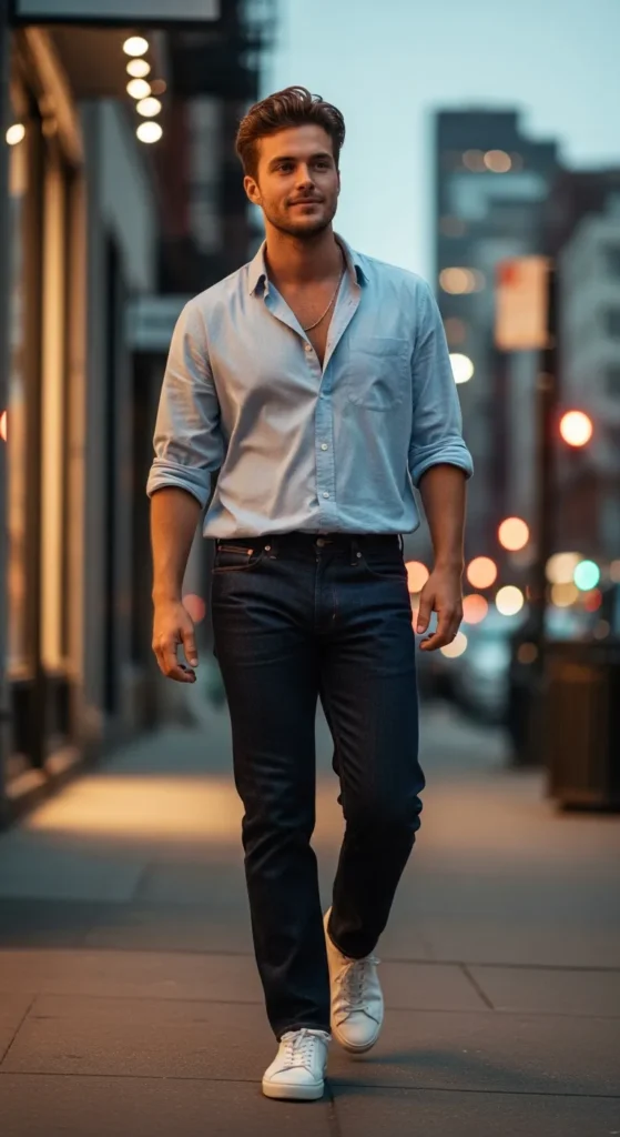 This outfit feels approachable and emotionally safe, like someone you instantly trust. A relaxed button-down with straight denim gives effortless charm, making it ideal for casual Valentine’s dates without losing aesthetic appeal.