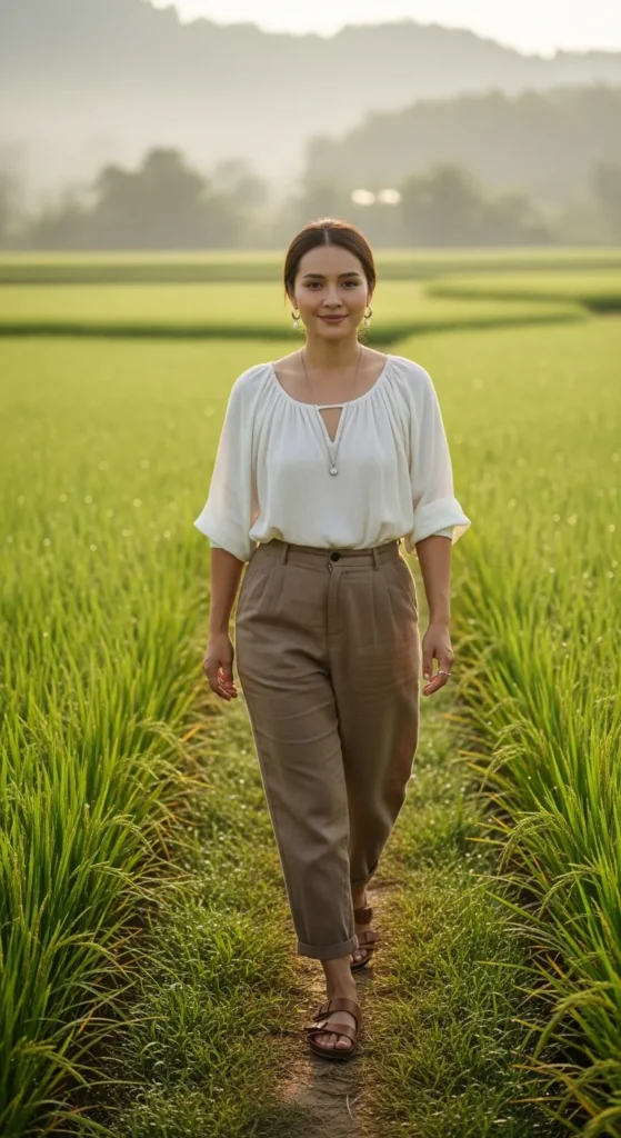 Stylist Suggestion: Choose a blouse with light drape and tuck it gently. This defines the waist while keeping the overall look soft and flattering in the humidity.