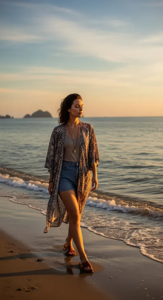 A lightweight kimono adds movement and sun protection while keeping the outfit breezy. It’s ideal for layering without trapping heat.