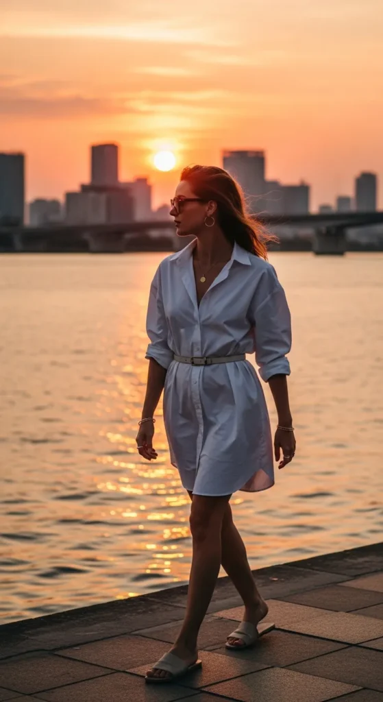 Stylist Suggestion: Roll the sleeves slightly and add tan leather sandals. This balances structure with ease and keeps the outfit breathable while still feeling intentional for warm urban exploring.
