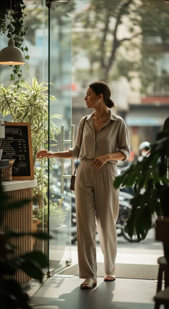 An airy peasant top paired with linen pants creates a breathable, culturally respectful outfit that feels relaxed and elegant in warm Vietnamese weather.