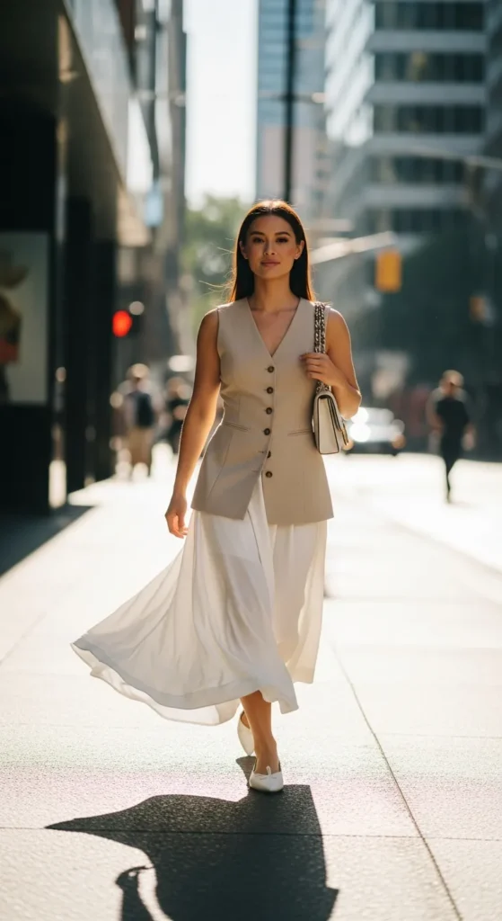 A tailored button-front vest worn with a white maxi skirt creates a polished outfit that feels modern, structured, and slightly unexpected for summer.