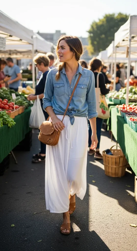 A soft chambray shirt tucked into a white maxi skirt creates a timeless outfit that feels easy, practical, and naturally stylish for everyday summer moments.