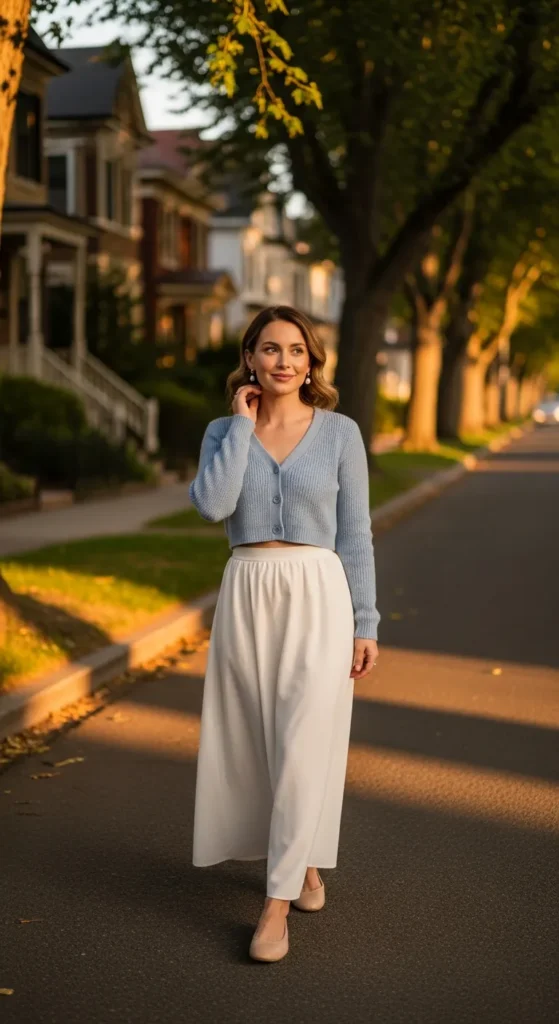 A soft cropped cardigan with a white maxi skirt creates a gentle, romantic summer outfit. The shorter knit balances the skirt’s volume while the cozy texture adds just enough warmth for breezy mornings or sunset strolls.