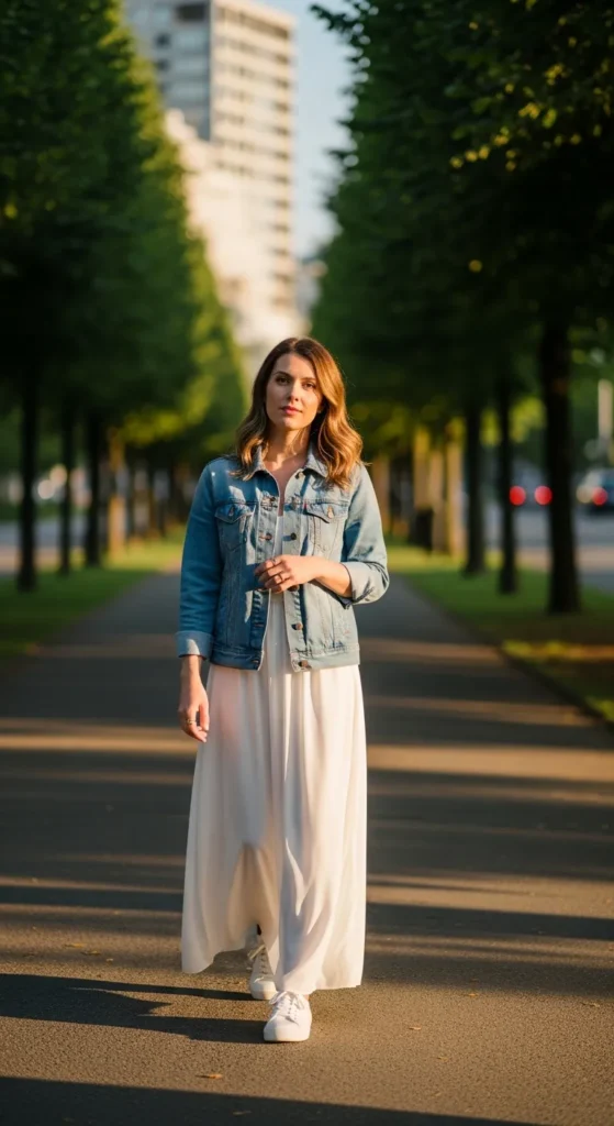 Layering a classic denim jacket over a white maxi skirt creates a balanced outfit that feels casual yet put together. It’s perfect for cooler evenings when you still want that breezy summer look.